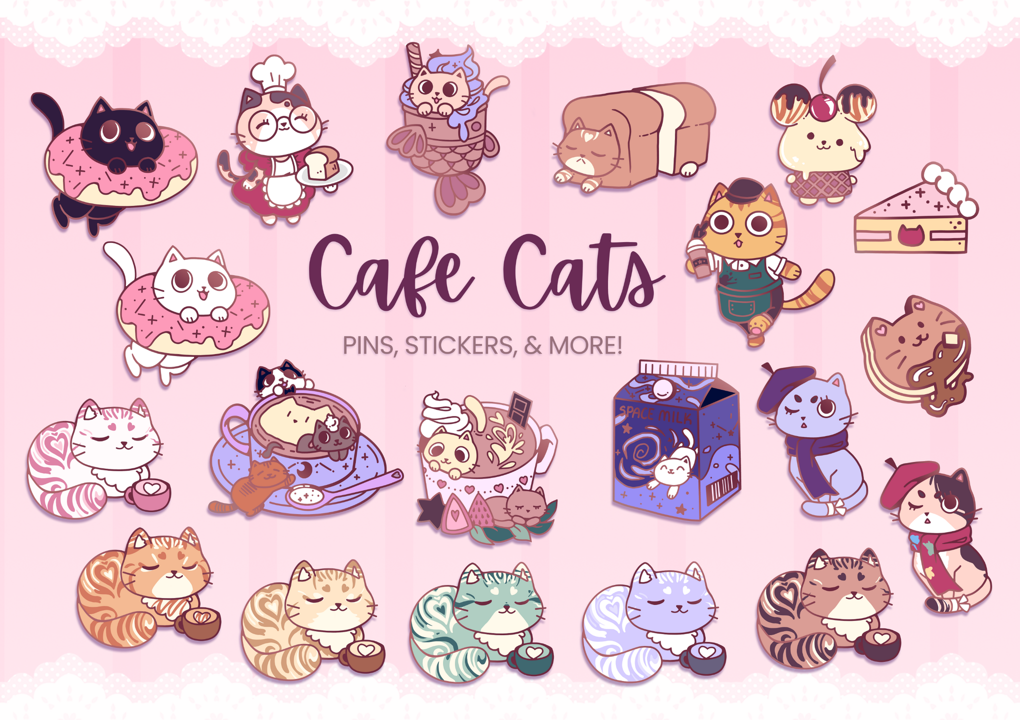 A collection of cute cat cafe inspired enamel pins and stickers! Funded during Backerkit's exclusive 2024 Pintopia event.