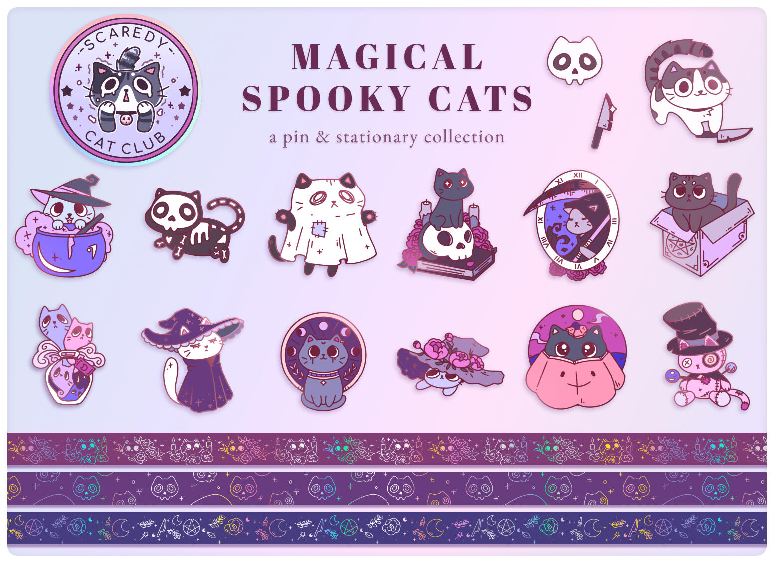 A collection of cute and spooky hard enamel pins, washi tape, stickers, and keychain charms.