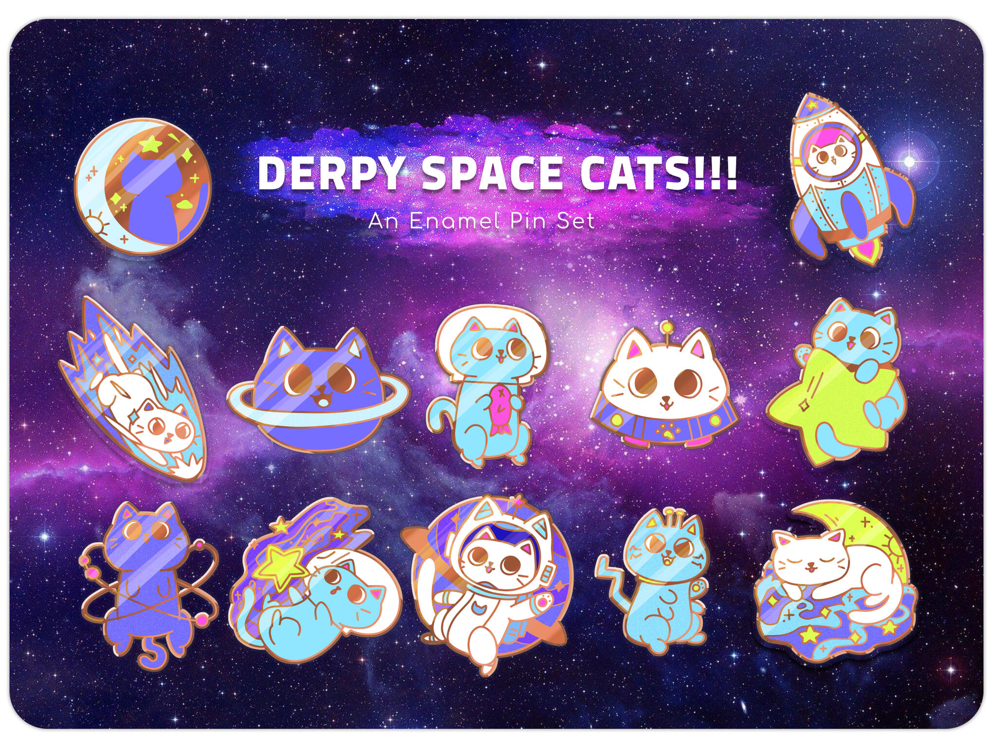 Cute space star and planet themed hard enamel pin collection - series of 12 derpy space cat pins and matching stickers.