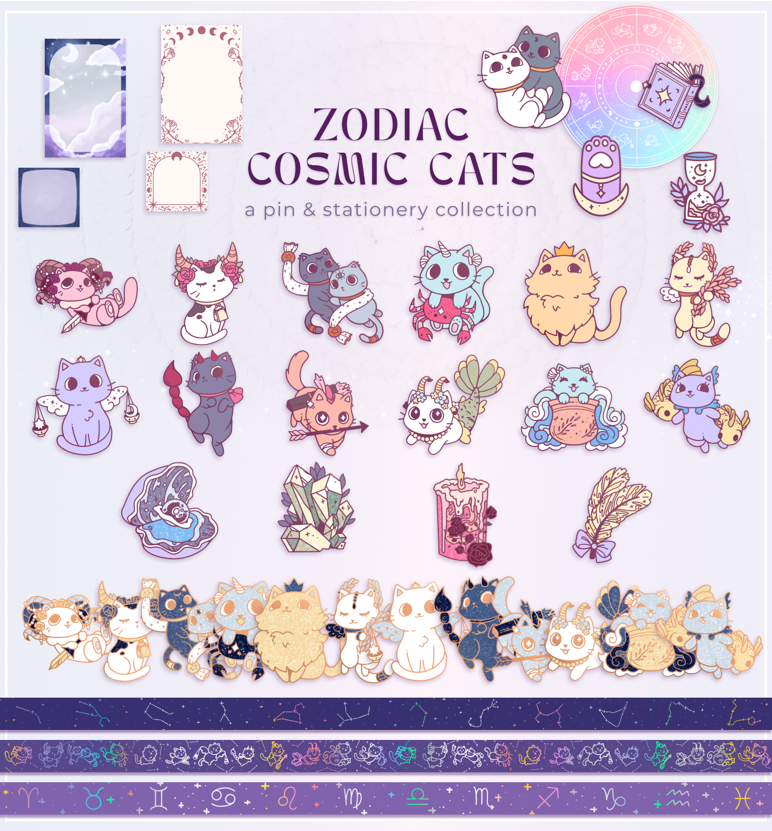 A collection of cute and mystical Zodiac hard enamel pins, stationery, and keychain charms!